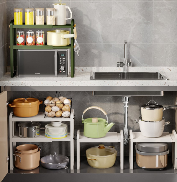 다용도 수납: 주방 용품, 식기류, 세제 등을 보관할 수 있는 다양한 선반과 칸막이가 있어 다양한 물품을 정리하기에 편리합니다.